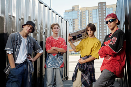 Group of young men standing in an urban setting, casually dressed and embodying relaxed summer vibes, with eyes toward the camera