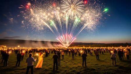 A captivating firework display illuminating the night sky during a cultural celebration, with spectators gathered to witness the spectacle, symbolizing joy and communal spirit.
