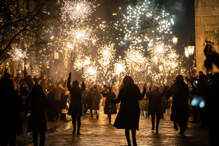 An evening scene shows a large crowd celebrating in a city. Bright lights emanate from the buildings and illuminate the people and falling particles, creating a festive atmosphere. The composition emphasizes the energy and joy of the event. Suitable for various commercial and editorial applications.