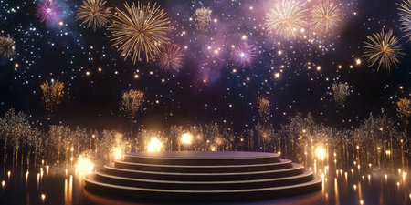 This vibrant 3D podium mockup features beautifully designed lanterns and dazzling fireworks against a stunning night sky, perfect for product presentations, exhibitions, or marketing events