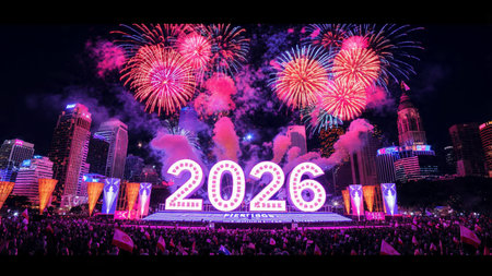 A large crowd gathers at night to watch a vibrant fireworks show celebrating the arrival of the year 2026.