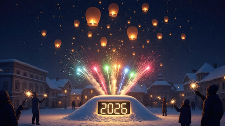 A nighttime scene features vibrant fireworks erupting over a snowy landscape, complemented by floating lanterns. The composition includes silhouetted figures observing the display, set against the backdrop of buildings. The artwork showcases vivid colors and a festive ambiance, suitable for various promotional or celebratory purposes.