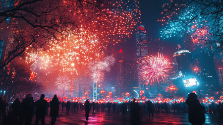 Spectacular fireworks light up the night sky over a city skyline, as crowds gather to celebrate New Year's Eve with vibrant colors and excitement.
