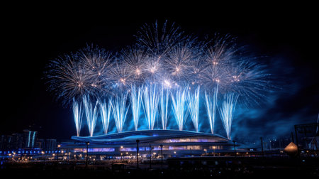 A breathtaking fireworks display lights up the night sky over a modern building, featuring vibrant blue colors and captivating explosions that create a festive atmosphere.