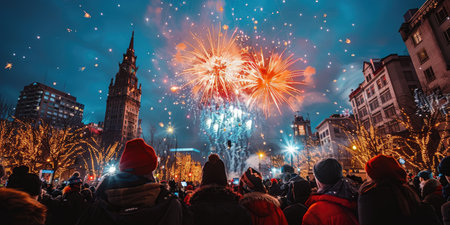Fireworks burst in a vibrant display against a darkening sky as people gather in a city square, eagerly welcoming the New Year. The crowd, adorned in winter clothing, stands entranced by the colorful explosions above. Surrounding buildings, adorned with twinkling lights, provide a festive backdrop, enhancing the celebratory atmosphere.