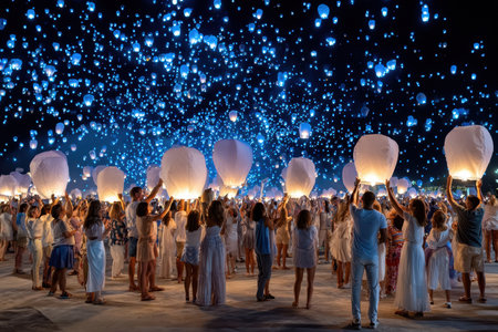 Large crowd gathers under the night sky, releasing glowing lanterns and creating a breathtaking spectacle.