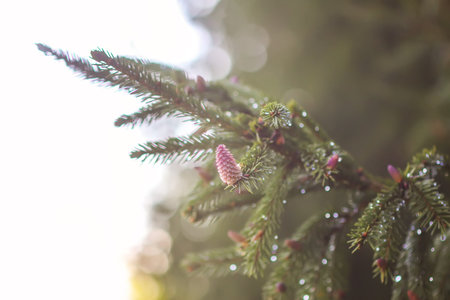 Fir tree in spring forest with the young soft cones in April. Seasonal nature details.