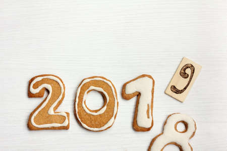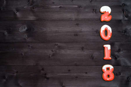 Happy new year 2018 sign symbol from red and white gingerbread cookies on dark wooden background, copy space. Christmas background, free space. Top view, flat lay