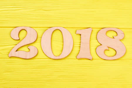 Wooden number 2018 on wooden yellow background. 2018 wood letters on yellow wooden table for 2018 New Year background. Happy New Year 2018.