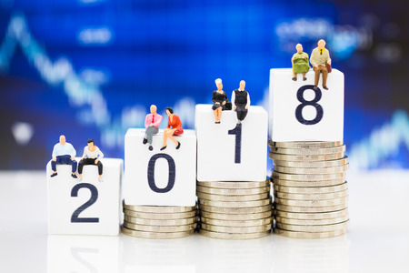 Miniature people. Group people sitting on wooden block 2018 with stack of coins to increase. Image use for background business concept.