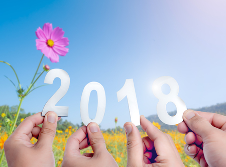 Happy new year concept of 2018,Hands holding Metal words of 2018 on flowers over blue sky