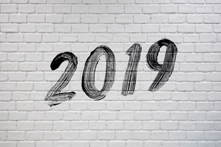 Brush stroke handwriting 2019 happy new year on abstract festive colorful bokeh light background,holiday greeting card