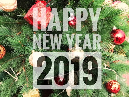 New Year decorative composition with wooden 2019 numbers and letters. Happy New Year festive card.