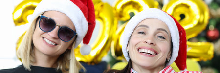 Portrait of two young smiling women against background of Christmas tree and numbers 2022