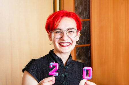 portrait of cute smiling young red-haired woman with round glasses with short haircut, holding candles in form of numbers 20 in her hands. Joyful girl with sincere smile on her birthday