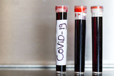 Test tube with blood of positive COVID-19 test and laboratory sample of blood testing for diagnosis new Corona virus infection.