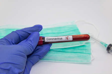 Coronavirus blood test 2019.Coronavirus came Doctor hand in medical glove holding test tube with Coronavirus positive blood in laboratory. Concept can be used in the design