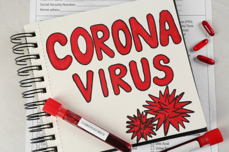 Notepad with words CORONA VIRUS and blood samples on light background, flat lay
