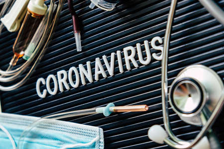 CORONAVIRUS. Protective medical mask with the inscription coronavirus on a dark background. The concept of protection from viruses. Selective focus.