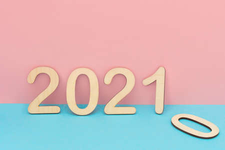 on a pink-blue background, the numbers 2021 made of wood, and next to the number 0. The concept is the change of the year, the beginning of the new year. Photo in pastel colors, horizontal