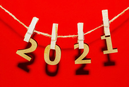 Closeup of colorful wooden number 2021 on wood table with copy space.