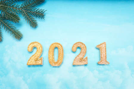 Happy New year 2021. Golden digits 2021 flat lay with copy space on black background. 2021 numbers with Christmas natural decorations.