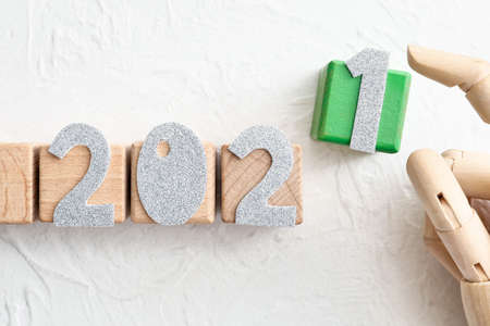 Number 2021 and 2022 on wooden block for new year. Start new year