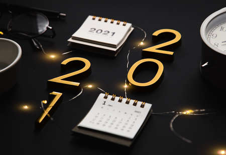 composition top view, gold numbers 2021 calendar and alarm clock on black background. new year's eve, to-do list
