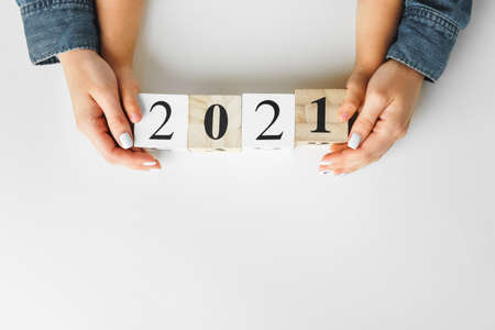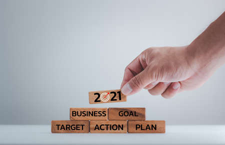 2021 New year resolution, Goal, Plan and action, human hand putting wood block with word.