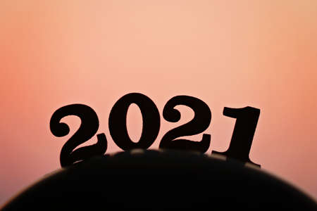 New Year 2021. The word 2021 behind the mountain at golden sunset and beautiful sky. Concept for vision year 2021