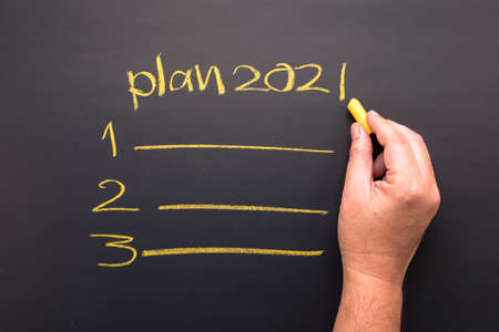 Hand writing topic of 2021 plan on chalkboard, goal setting and priority in coming year