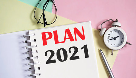 PLAN 2021 on the notebook with pen, alarm clock on pink background