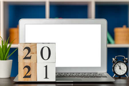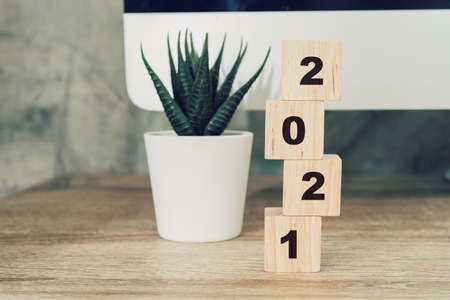 2021 happy new year on wood block on wood table desktop computer and pot plant. new year concept
