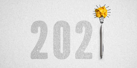 number 2021 and crumpled paper forming a lightbulb symbol on paper background