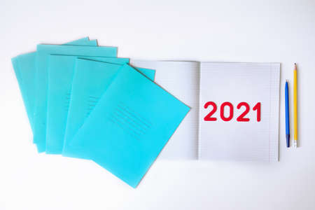 The new school year. school supplies. studies in 2021. notebooks and pens on the table.