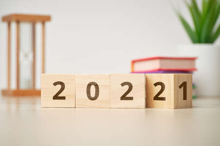 turning year 2020 to 2021 on wooden blocks, new year concept