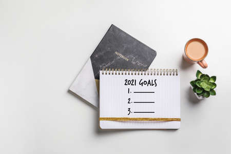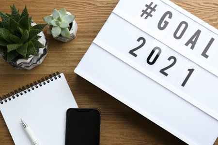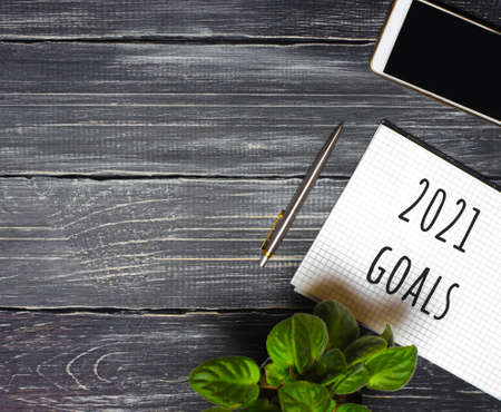 2021 Goals concept. Desktop with notebook, phone, pen. Motivation, inspiration. Planning, plans and tasks. New business ideas. Setting goal, target.
