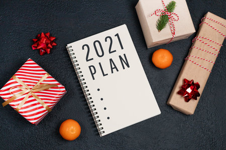 2021 plan concept with paper notebook for notes, many gift boxes, tangerines and decor on dark background. Flat lay, top view. To do list for the year