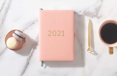 Pink coral colored diary for the year 2021, pen, coffee, macaron cookie. Marble background