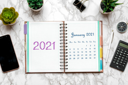 Open Calendar January 2021, glasses, cup of coffee, pen, smartphone, succulents on marble table Top view Flat lay Education, goals, resolutions, plan, small owner business concept Home workplace.