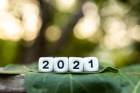 cubes of white color with the numbers 2021 on a green leaf of a tree. background blurred foliage trees in sunlight