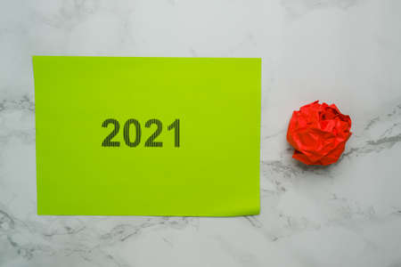 A picture of red crumpled paper symbol as 2020 is disaster caused by Covid-19. Green paper with 2021 word symbol as the year will be new great year.