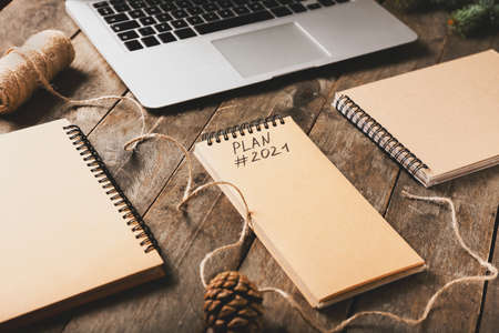 Planning New Year goald on empty notepad in the year 2021, top view on brown background texture, top view copy space, space for text modern design