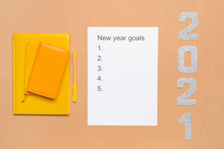 Flat lay of notebook and number 2021 on beige color background. New year goals, Business and finance planing concept. Copy space, top view