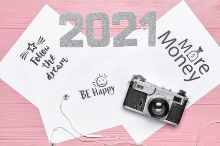 Paper sheets with different goals, figure 2021 and photo camera on color wooden background