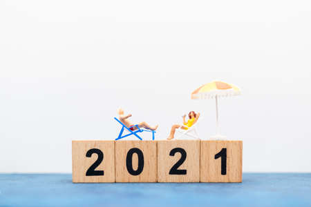 Miniature people wearing swimsuit sitting on the lounge chair at wooden block 2021