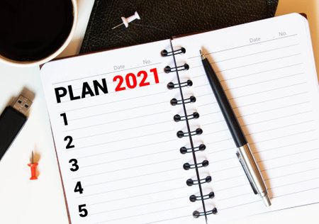 Office worker writes a list for 2021 in a notebook. Planning concept, goal setting