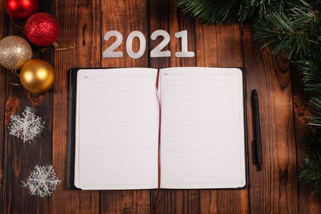 An open white notebook on the table with Christmas decorations. Targets for 2021, empty space for entries. Plans and challenges for the coming year, desires and dreams.