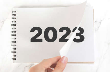 New year goals 2023 womans hand changes the number on a notepad. Resolutions, plan and goals, checklist concept. New Year 2023 template, copy space.