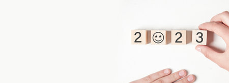 White cube block flipping from 2022 to 2023 woman hand on white background